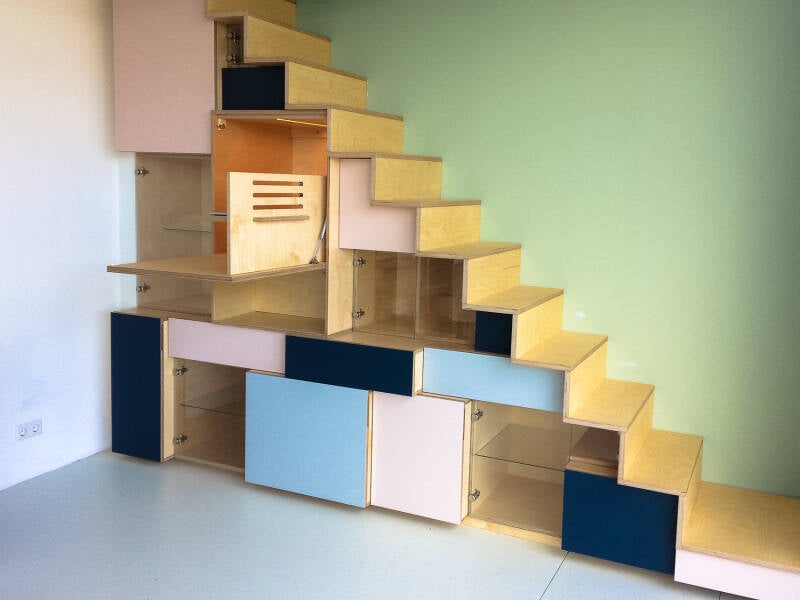 Multifunctionele Trapkast met een pallet aan cabinetten, kasten, vitrines, lades én een moderne variant op de klassieke secretaire: een ingebouwde staande werkcel. De werkcel is van binnen voorzien van een ingebouwde dimbare LED-strip en electra.
